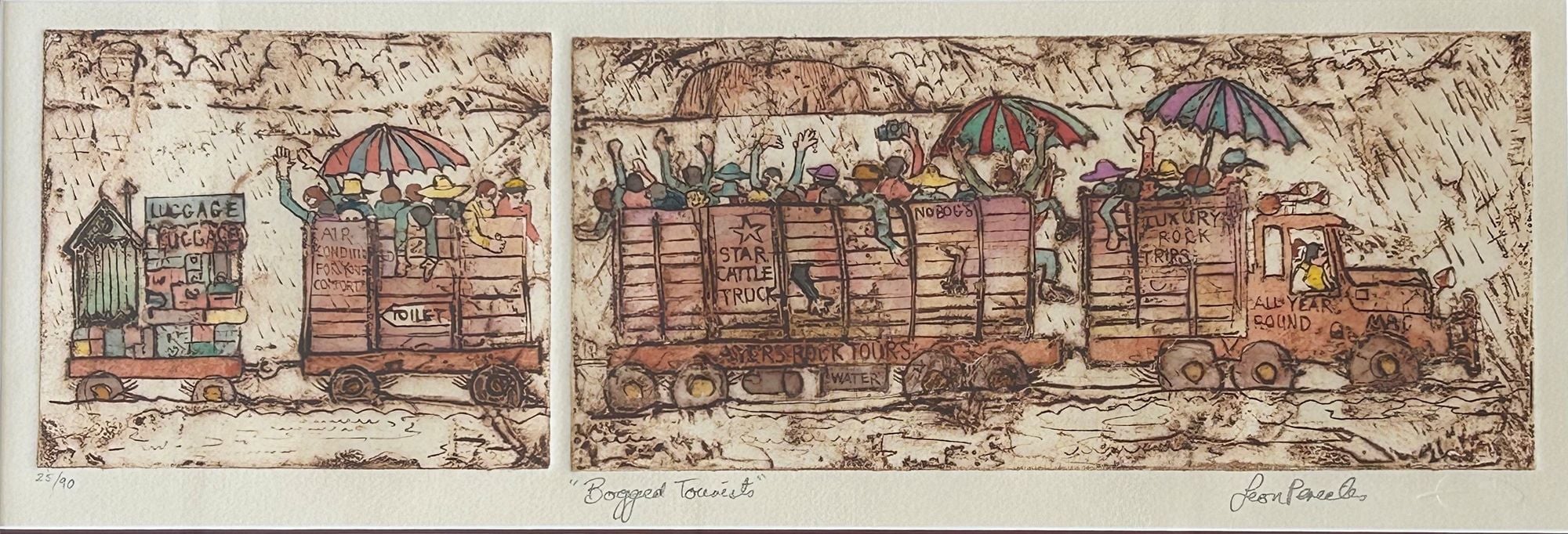 Leon PericlesBogged Tourists Signed, titled and editioned in margin Hand coloured etching 13.5 x 47.5cm (image size) Framed (36.5 x 69 x 2cm)